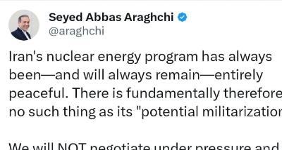 Seyyed Abbas Araghchi, Islamic Repiblic of Iran's minister of foreign affairs updated his X account with the following message: