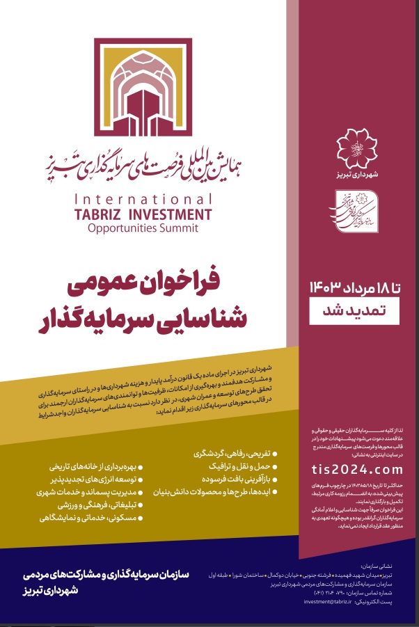 دعوت شهرداری تبریز از علاقمندان به سرمایه گذاری در تبریز در قالب محورها و فرصت های سرمایه گذاری مندرج در پایگاه اینترنتی tis2024.com حداکثر تا تاریخ 18 مرداد ماه سالجاری مطابق با 8 آگوست 2024