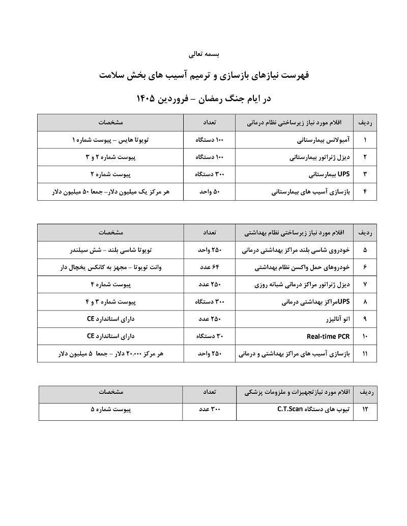 اعلان اقلام مورد نیاز زیرساختی و دارویی درمانگاهها و بیمارستانهای تخریب شده در جنگ رمضان